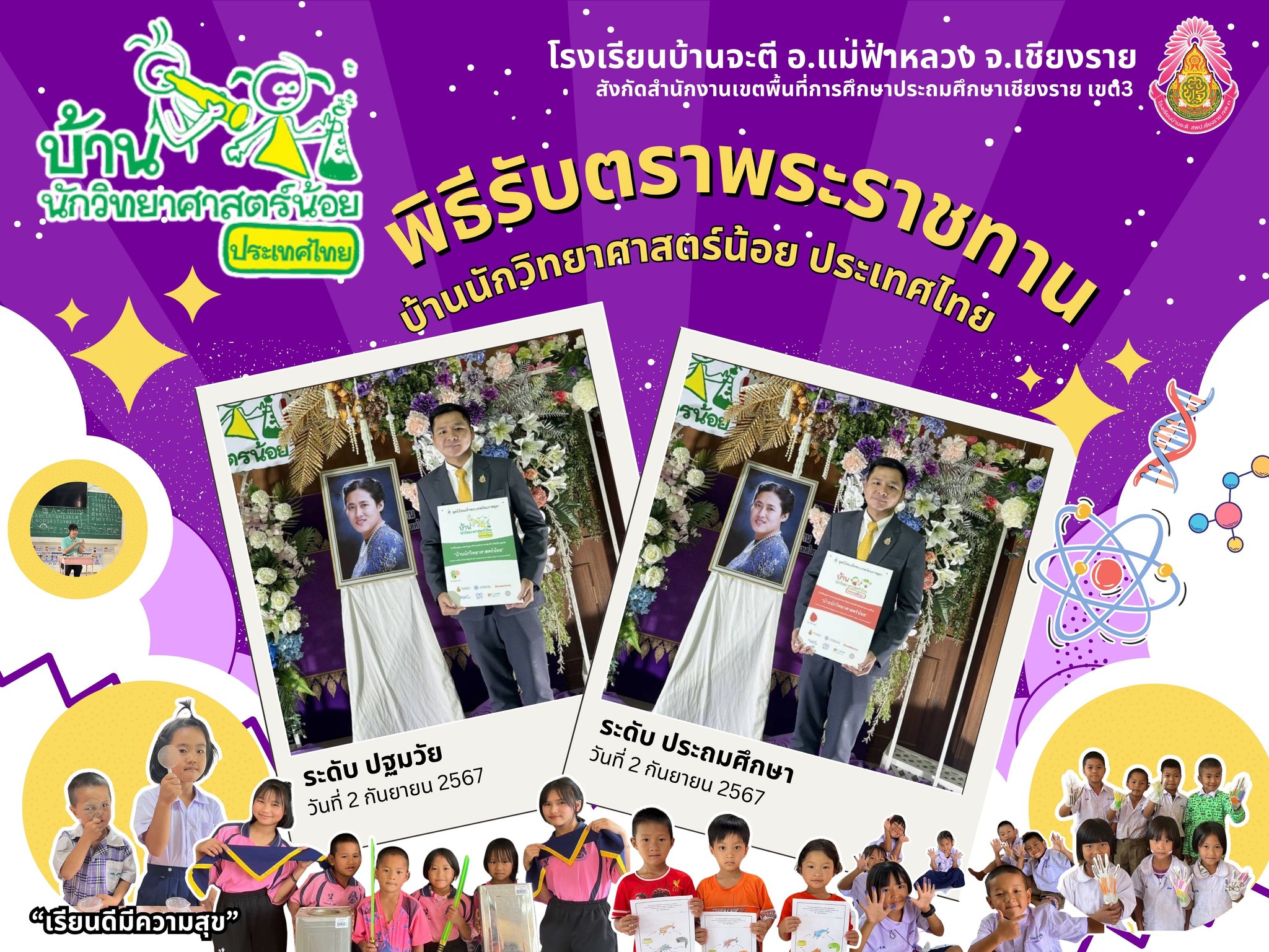 นายชัชวาลย์ ใจอินทร์ ผู้อำนวยการโรงเรียนบ้านจะตี ได้เข้าร่วมพิธีรับตราพระราชทาน "บ้านวิทยาศาสตร์น้อย ประเทศไทย"ระดับปฐมวัย รุ่นที่ 7 รอบที่ 3 ปีการศึกษา 2567-2571 และระดับประถมศึกษา รุ่นที่ 2 รอบที่ 1 ปีการศึกษา 2567-2571 ณ ห้องประชุมสายน้ำจัน สำนักงานเชตพื้นที่การศึกษาประถมศึกษาเชียงราย เขต 3