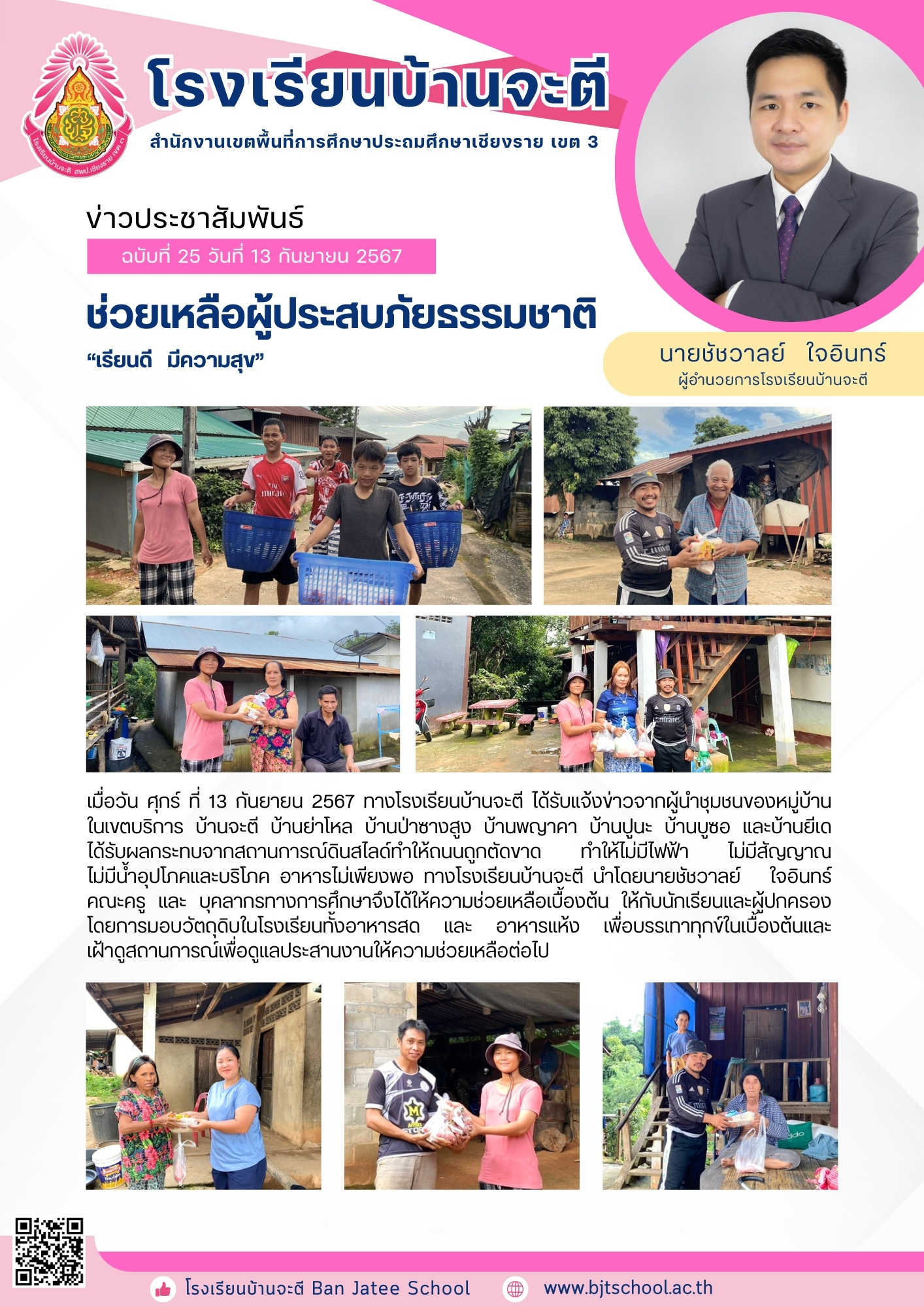 ทางโรงเรียนบ้านจะตี ได้รับแจ้งข่าวจากผู้นำชุมชนของหมู่บ้านในเขตบริการ บ้านจะตี บ้านย่าโหล บ้านป่าซางสูง บ้านพญาคา บ้านปูนะ บ้านบูซอ และบ้านยีเด ได้รับผลกระทบจากสถานการณ์ดินสไลด์ทำให้ถนนถูกตัดขาด ทำให้ไม่มีไฟฟ้า ไม่มีสัญญาณ ไม่มีน้ำอุปโภคและบริโภค อาหารไม่เพียงพอ ทางโรงเรียนบ้านจะตี นำโดยนายชัชวาลย์ ใจอินทร์ คณะครู และ บุคลากรทางการศึกษาจึงได้ให้ความช่วยเหลือเบื้องต้น ให้กับนักเรียนและผู้ปกครองโดยการมอบวัตถุดิบในโรงเรียนทั้งอาหารสด และ อาหารแห้ง เพื่อบรรเทาทุกข์ในเบื้องต้นและเฝ้าดูสถานการณ์เพื่อดูแลประสานงานให้ความช่วยเหลือต่อไป