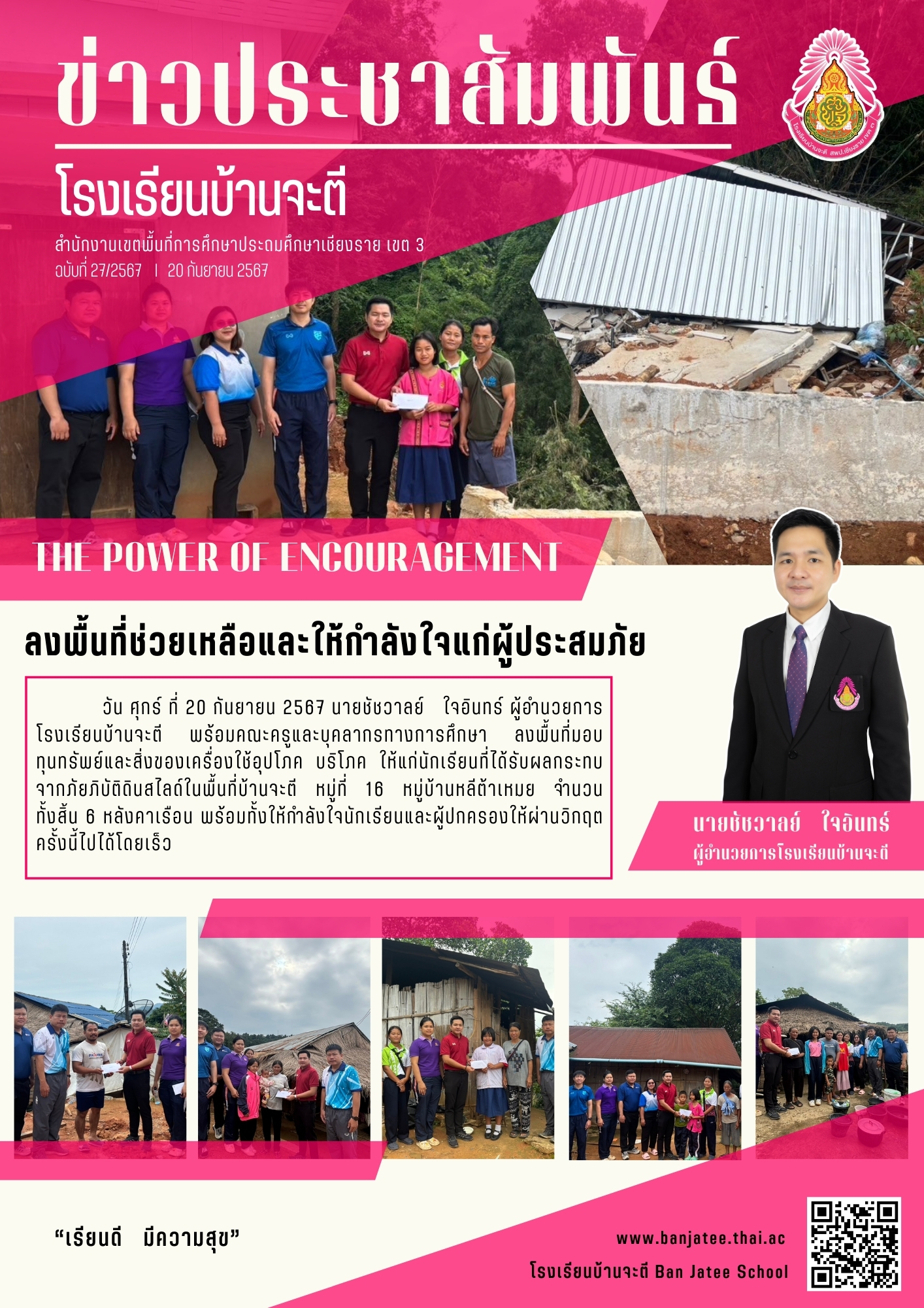 นายชัชวาลย์ ใจอินทร์ ผู้อำนวยการโรงเรียนบ้านจะตี พร้อมคณะครูและบุคลากรทางการศึกษา ลงพื้นที่มอบทุนทรัพย์และสิ่งของเครื่องใช้อุปโภค บริโภค ให้แก่นักเรียนที่ได้รับผลกระทบจากภัยภิบัติดินสไลด์ในพื้นที่บ้านจะตี หมู่ที่ 16 ณ หมู่บ้านหลีต้าเหมย จำนวนทั้งสิ้น 6 หลังคาเรือน พร้อมทั้งให้กำลังใจนักเรียนและผู้ปกครองให้ผ่านวิกฤตครั้งนี้ไปได้โดยเร็ว