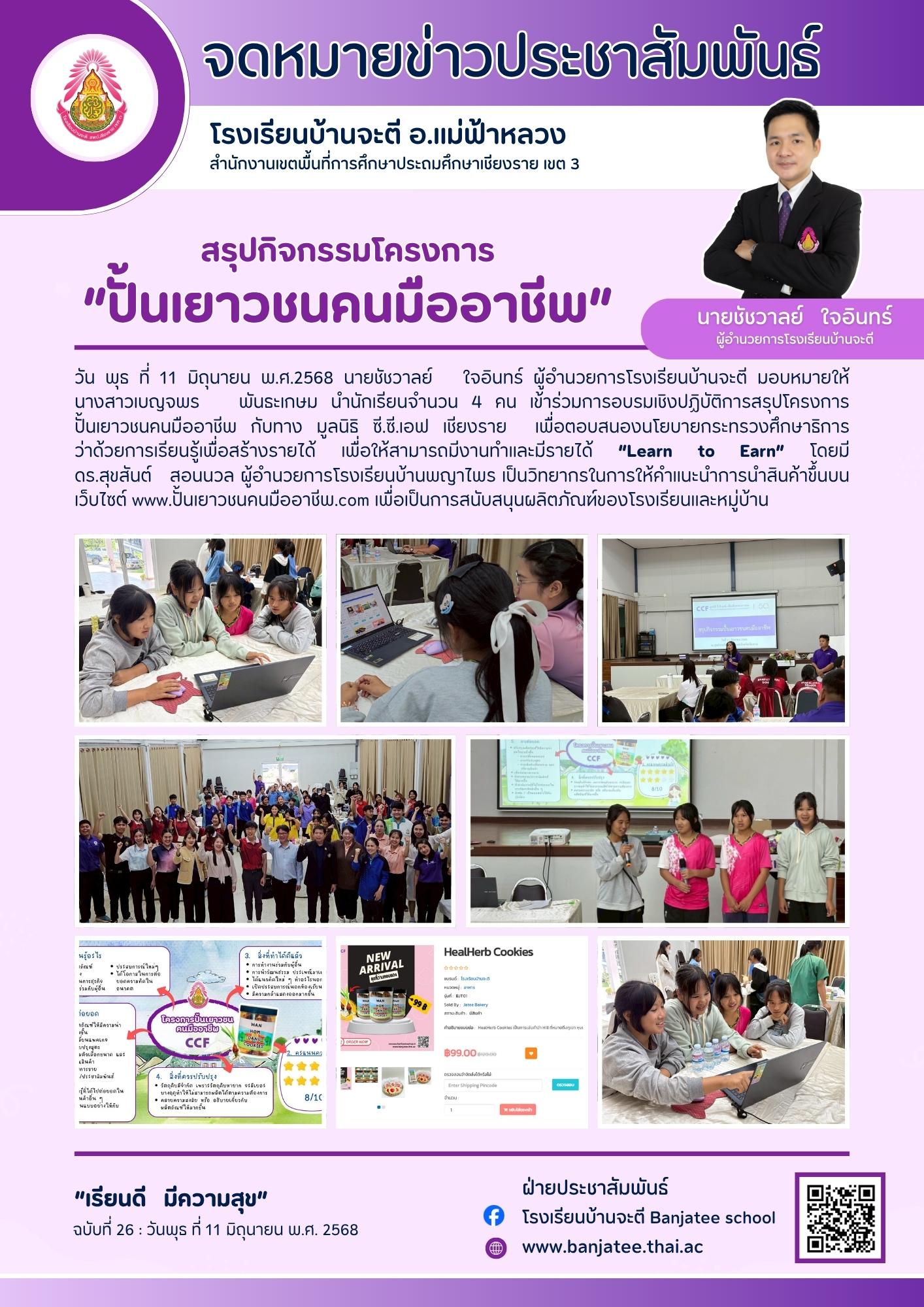 นายชัชวาลย์ ใจอินทร์ ผู้อำนวยการโรงเรียนบ้านจะตี มอบหมายให้ นางสาวเบญจพร พันธะเกษม นำนักเรียนจำนวน 4 คน เข้าร่วมการอบรมเชิงปฏิบัติการสรุปโครงการปั้นเยาวชนคนมืออาชีพ กับทาง มูลนิธิ ซี.ซี.เอฟ เชียงราย เพื่อตอบสนองนโยบายกระทรวงศึกษาธิการว่าด้วยการเรียนรู้เพื่อสร้างรายได้ เพื่อให้สามารถมีงานทำและมีรายได้ “Learn to Earn” โดยมี ดร.สุขสันต์ สอนนวล ผู้อำนวยการโรงเรียนบ้านพญาไพร เป็นวิทยากรในการให้คำแนะนำการนำสินค้าขึ้นบนเว็บไซต์ www.ปั้นเยาวชนคนมืออาชีhttp://xn--v3c.com/ เพื่อเป็นการสนับสนุนผลิตภัณฑ์ของโรงเรียนและหมู่บ้าน