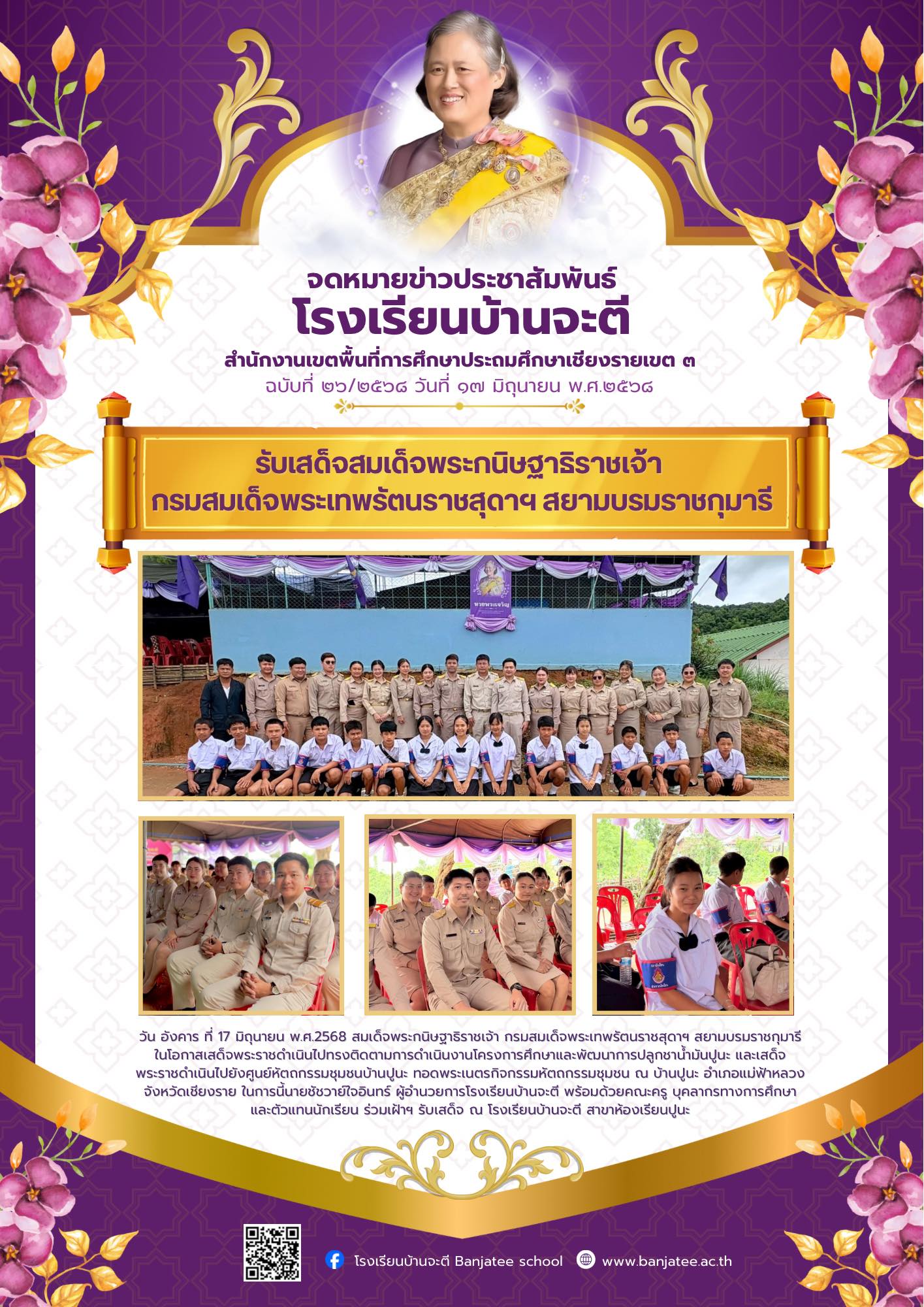 สมเด็จพระกนิษฐาธิราชเจ้า กรมสมเด็จพระเทพรัตนราชสุดาฯ สยามบรมราชกุมารี ในโอกาสเสด็จพระราชดำเนินไปทรงติดตามการดำเนินงานโครงการศึกษาและพัฒนาการปลูกชาน้ำมันปูนะ และเสด็จพระราชดำเนินไปยังศูนย์หัตถกรรมชุมชนบ้านปูนะ ทอดพระเนตรกิจกรรมหัตถกรรมชุมชน ณ บ้านปูนะ อำเภอแม่ฟ้าหลวง จังหวัดเชียงราย ในการนี้นายชัชวาย์ใจอินทร์ ผู้อำนวยการโรงเรียนบ้านจะตี พร้อมด้วยคณะครู บุคลากรทางการศึกษา และตัวแทนนักเรียน ร่วมเฝ้าฯ รับเสด็จ ณ โรงเรียนบ้านจะตี สาขาห้องเรียนปูนะ