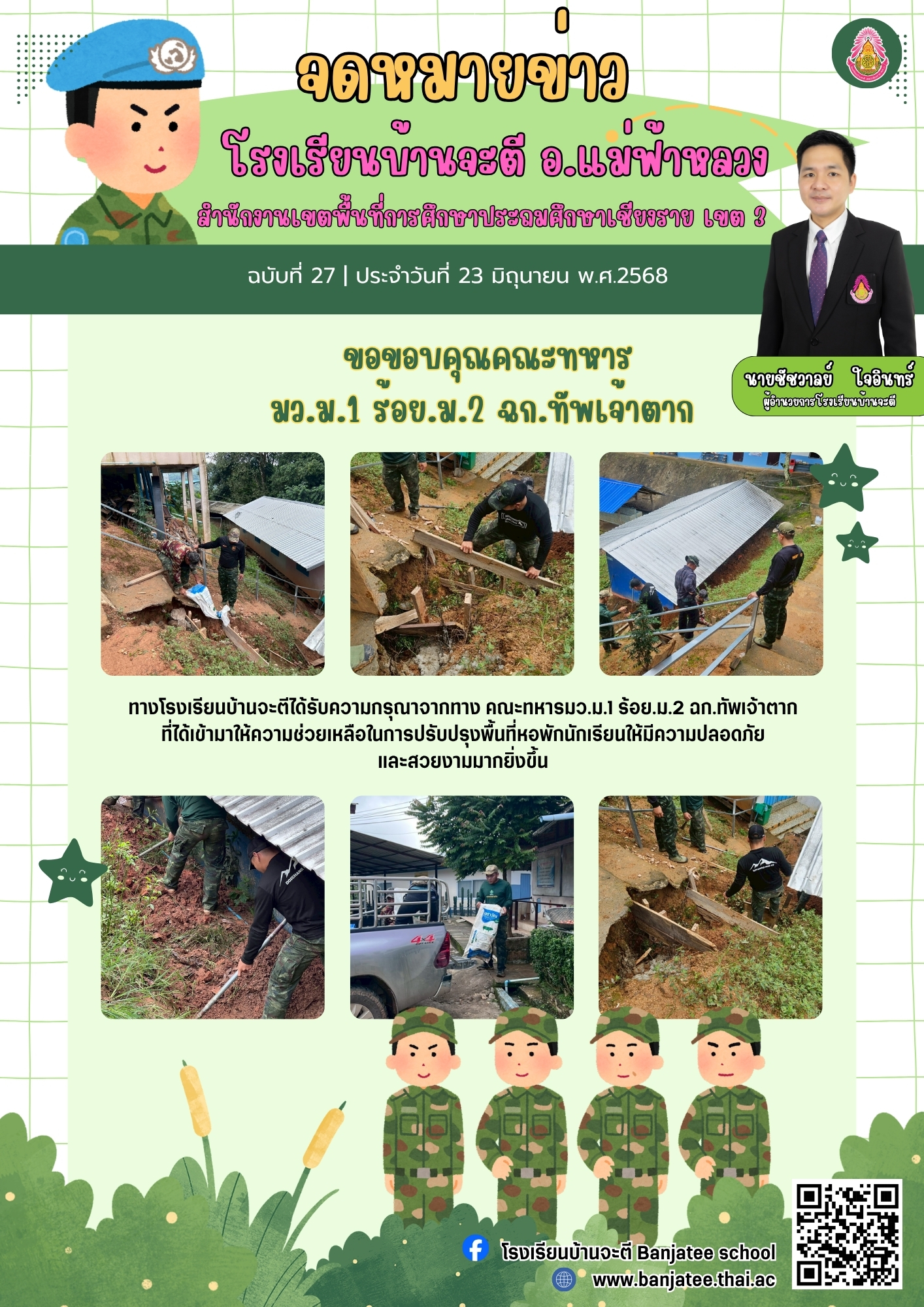 ทางโรงเรียนบ้านจะตีได้รับความกรุณาจากทาง คณะทหารมว.ม.1 ร้อย.ม.2 ฉก.ทัพเจ้าตาก ที่ได้เข้ามาให้ความช่วยเหลือในการปรับปรุงพื้นที่หอพักนักเรียนให้มีความปลอดภัย
