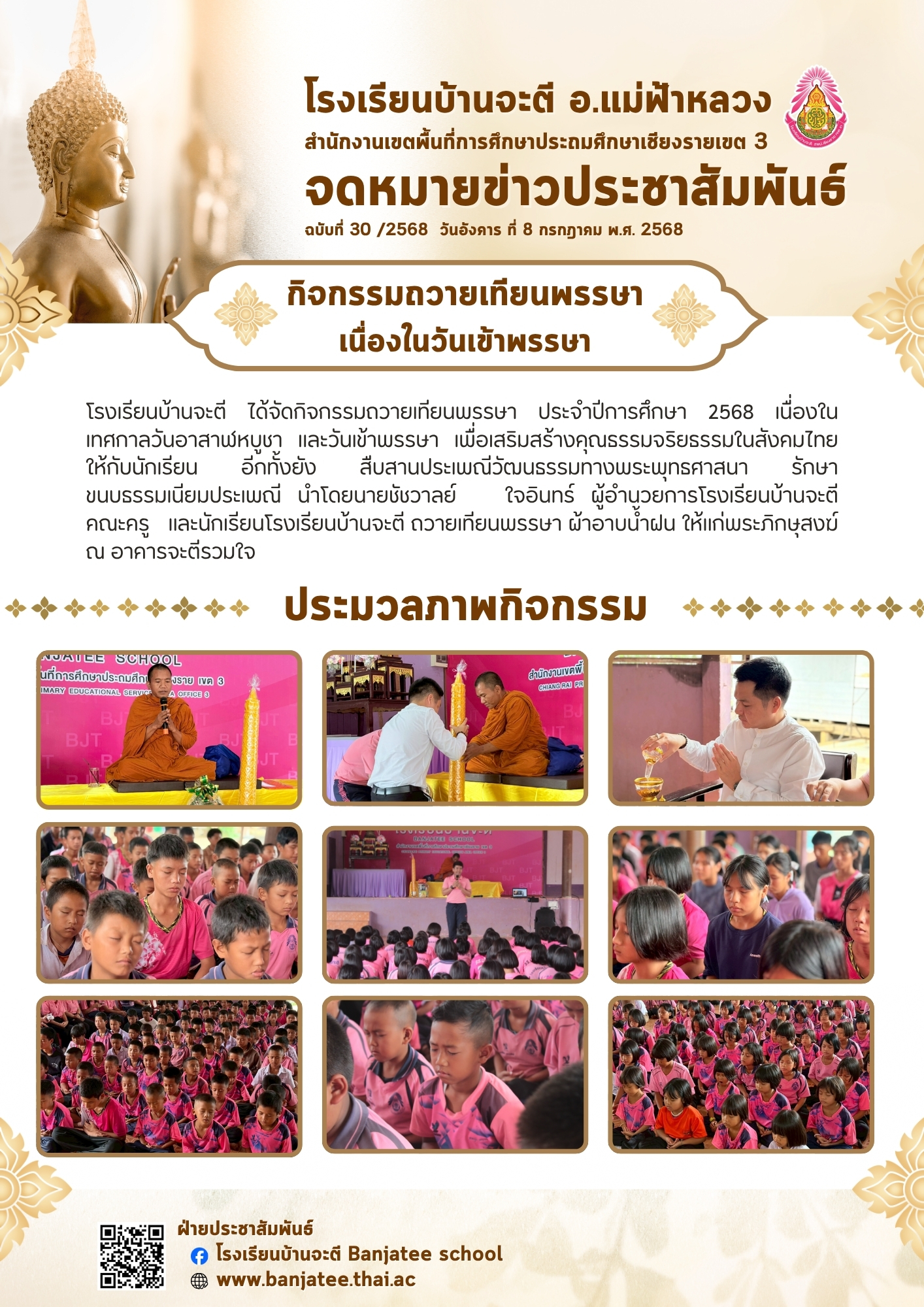 โรงเรียนบ้านจะตี ได้จัดกิจกรรมถวายเทียนพรรษา ประจำปีการศึกษา 2568 เนื่องในเทศกาลวันอาสาฬหบูชา และวันเข้าพรรษา เพื่อเสริมสร้างคุณธรรมจริยธรรมในสังคมไทย ให้กับนักเรียน อีกทั้งยัง สืบสานประเพณีวัฒนธรรมทางพระพุทธศาสนา รักษาขนบธรรมเนียมประเพณี นำโดยนายชัชวาลย์ ใจอินทร์ ผู้อำนวยการโรงเรียนบ้านจะตี คณะครู และนักเรียนโรงเรียนบ้านจะตี ถวายเทียนพรรษา ผ้าอาบน้ำฝน ให้แก่พระภิกษุสงฆ์ ณ อาคารจะตีรวมใจ