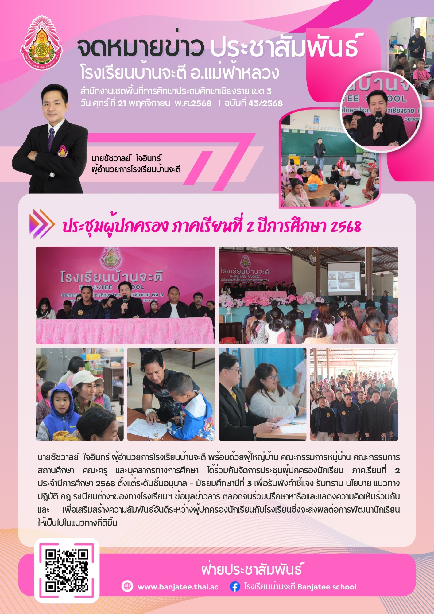 นายชัชวาลย์ ใจอินทร์ ผู้อำนวยการโรงเรียนบ้านจะตี พร้อมด้วยผู้ใหญ่บ้าน คณะกรรมการหมู่บ้าน คณะกรรมการสถานศึกษา คณะครู เเละบุคลากรทางการศึกษา ได้ร่วมกันจัดการประชุมผู้ปกครองนักเรียน ภาคเรียนที่ 2 ประจำปีการศึกษา 2568 ตั้งแต่ระดับชั้นอนุบาล - มัธยมศึกษาปีที่ 3 เพื่อรับฟังคำชี้แจง รับทราบ นโยบาย แนวทางปฏิบัติ กฎ ระเบียบต่างๆของทางโรงเรียนฯ ข้อมูลข่าวสาร ตลอดจนร่วมปรึกษาหารือและแสดงความคิดเห็นร่วมกัน และ เพื่อเสริมสร้างความสัมพันธ์อันดีระหว่างผู้ปกครองนักเรียนกับโรงเรียนซึ่งจะส่งผลต่อการพัฒนานักเรียน ให้เป็นไปในแนวทางที่ดีขึ้น